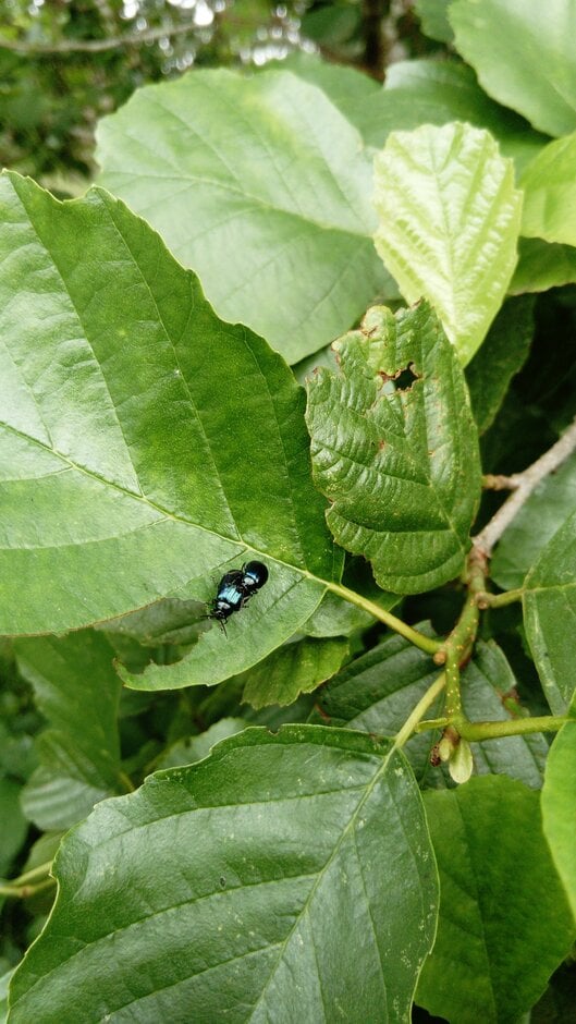 Alder leaf beetle is an 7-8 mm long dark metallic blue leaf beetle that feeds on alder (Alnus) and is occasionally found on other trees such as beech (Fagus sylvatica), hazel (Corylus), hornbeam (Carpinus betulus) and apple (Malus). It overwinters as adults which emerge in the spring, sometimes in large numbers.