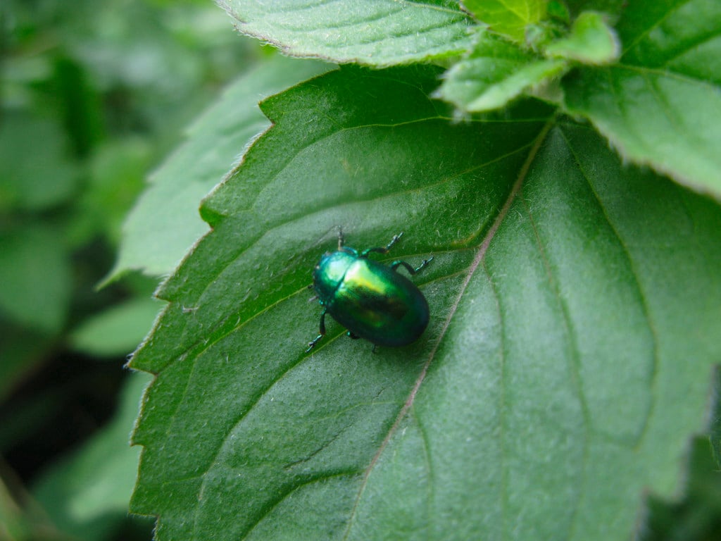 There is another beetle native to Britain, known as the green mint beetle, Chrysolina herbacea. This is 8-9mm in length and is a shiny emerald green. The black larvae are similar to those of the blue mint beetle. Pale green caterpillars of several moths e.g. Pyrausta spp ., are also found on mint; they loosely spin together foliage at the shoot tips with silk threads and eat the leaves. Some other species of moth caterpillar and slugs and snails also sometimes eat mint leaves.