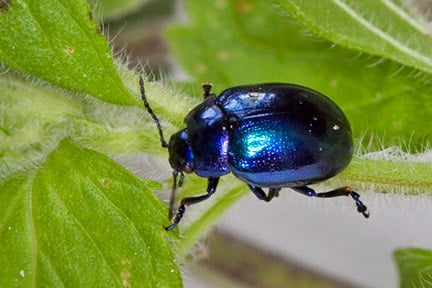 Blue mint beetle is a leaf beetle (family Chrysomelidae), there are about 250 species of leaf beetle found in Britain. Almost all feed on living plants, most are do not have a noticeable effect on garden plants. They range in size from size from 1 mm to 18 mm, many are colourful and many species are local or rare. More information on British leaf beetles can be found from .