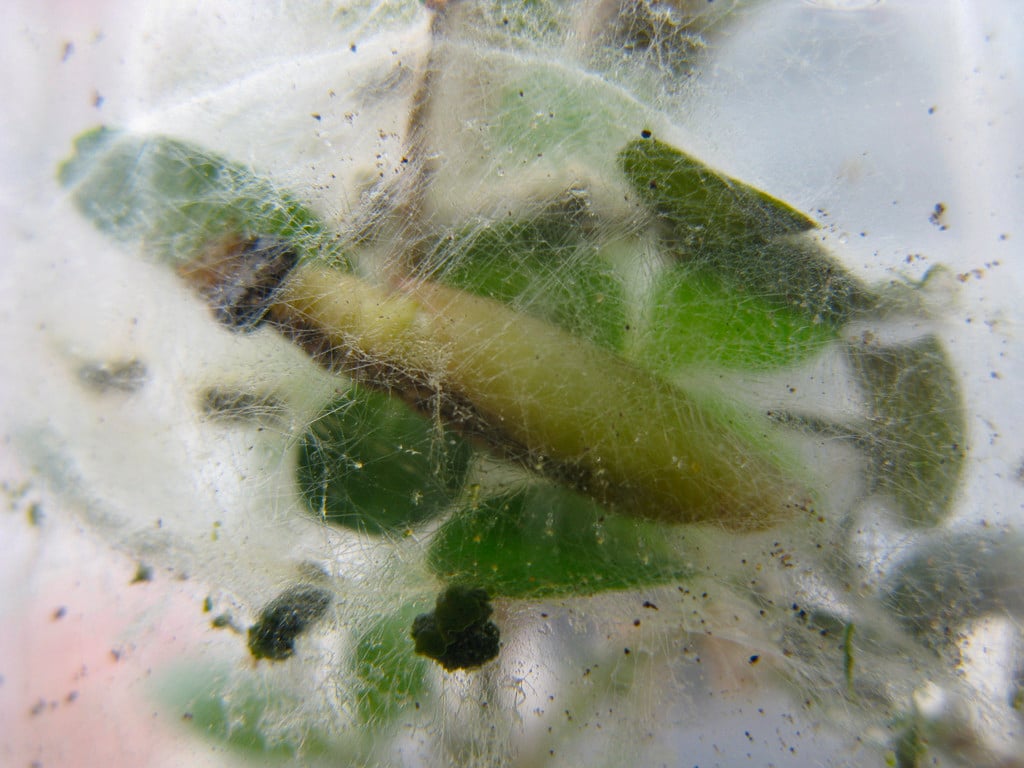 - The pupae are concealed in a cocoon of white webbing spun among leaves and twigs
