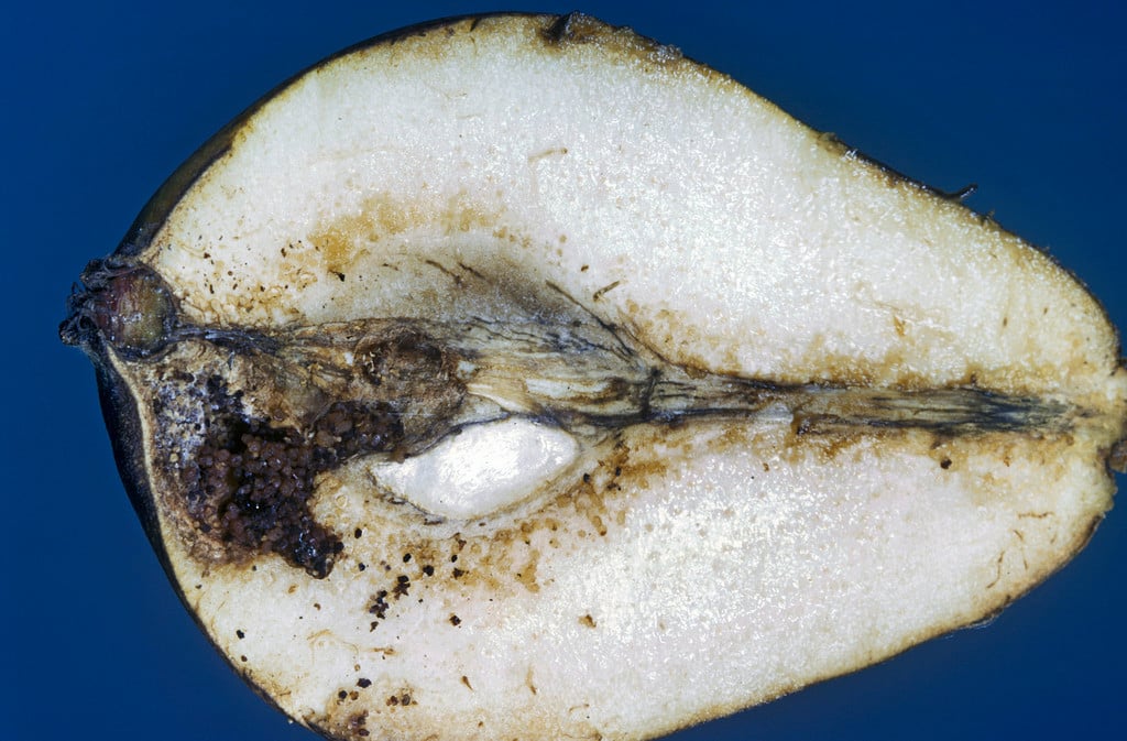 - When the fruit is cut open, the tunnel and feeding damage inside the core can be seen, together with the caterpillar’s excrement pellets (frass)
