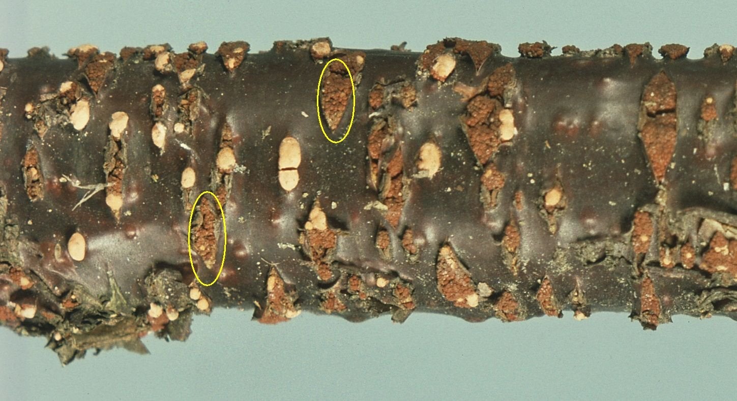 - After death, pinhead-sized orange or coral-pink spore pustules of the causal fungus appear on the