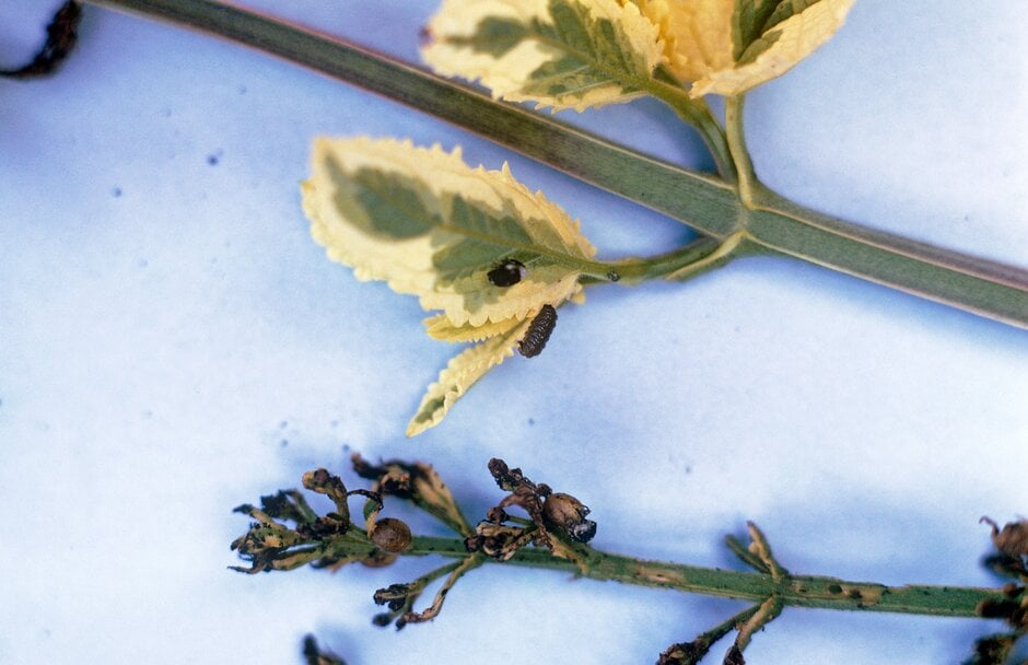Main symptoms - Small greyish-white beetles with black circular marks on the wing cases and slug-like larvae. Leaves at the shoot tips and flowers are eaten