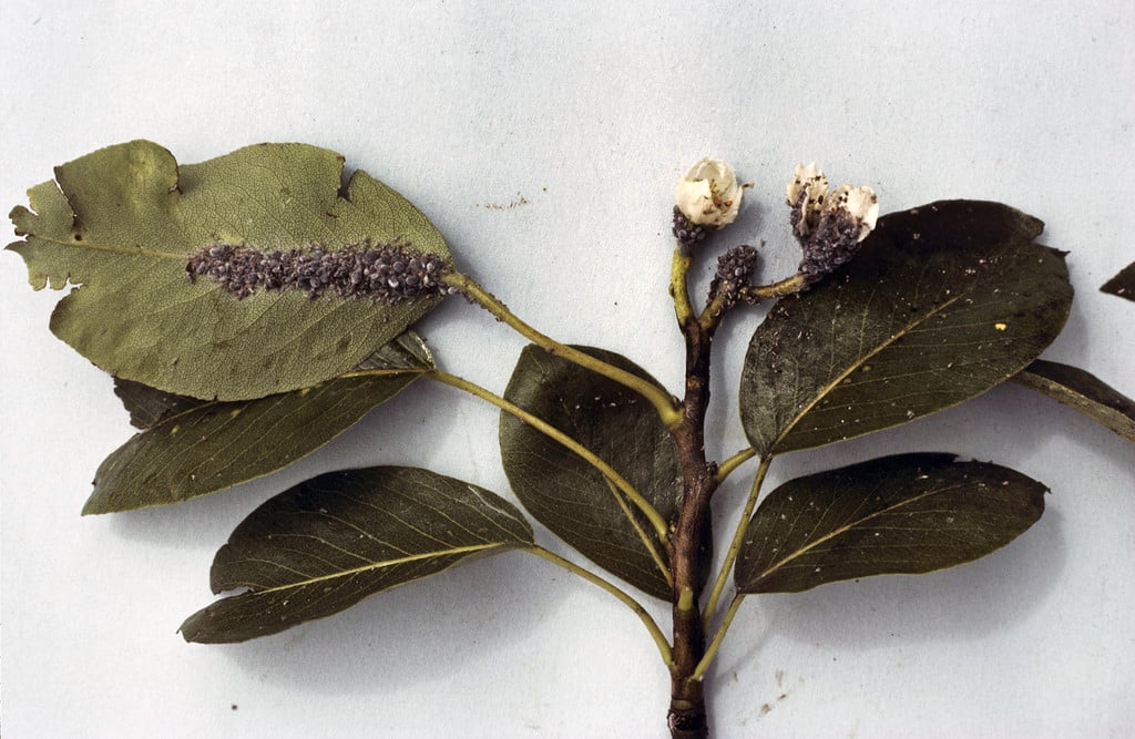 Aphids excrete a sugary substance, known as honeydew that makes the foliage and fruits sticky and can attract ants. A black sooty mould often grows on the honeydew, which reduces the amount of sunlight reaching the leaves and can spoil the appearance of the fruit.