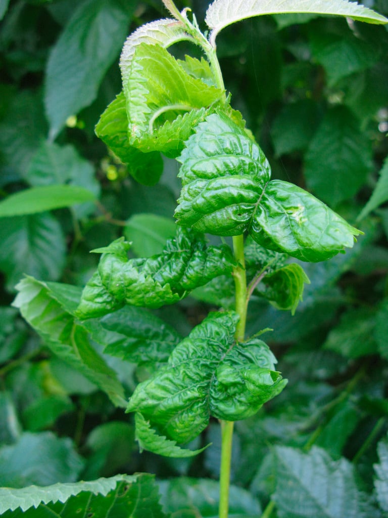 Many aphids have substances in their saliva that cause a variety of symptoms, such as stunted growth, leaf curling, distorted fruits and discolouration of the foliage.
