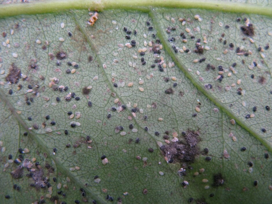 - You may also see flat, oval, creamy white scale-like nymphs (sometimes called larva and pupa) on the underside of leaves. If these nymphs are black they have probably been parasitised by an Encarsia wasp and are dead