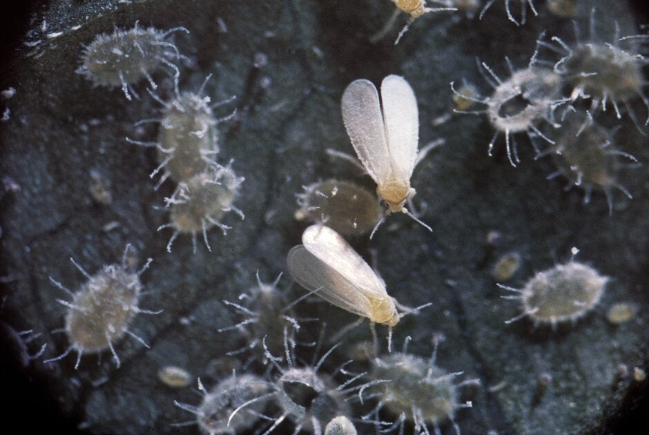 Glasshouse whitefly is a sap-sucking insect that breeds rapidly and produces many generations in warm greenhouse conditions. The adults and their whitish scale-like nymphs (also known as larvae and pupae) live on the underside of leaves where they feed on sap, weakening the plants. They lay greyish white cylindrical eggs either singly or in circles on the underside of the leaves.