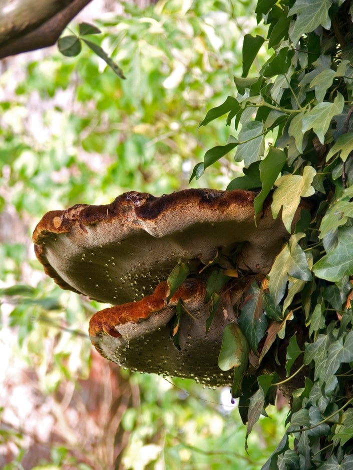 Spores of heartwood fungi need to reach the tree’s heartwood in order to become established. Spores can be blown in the wind or carried (e.g. by insects) into exposed heartwood through a wound. Once established, the fungus slowly decomposes the wood using enzymes that breakdown the tough heartwood tissue. By the time a fruiting body is produced and visible on the trunk of a living tree, the fungus will likely have been there for many years. They can live within a tree for decades causing no change to the health of the tree, and tree declines are often due to a secondary infection or environmental cause.