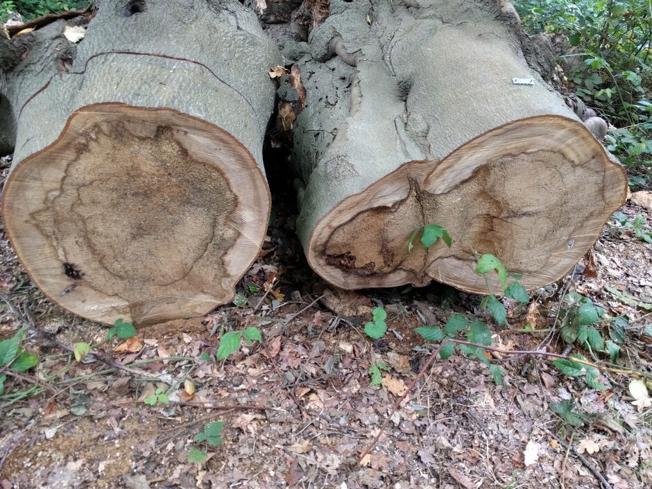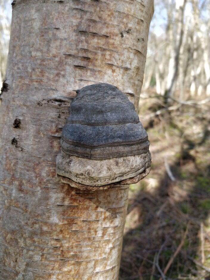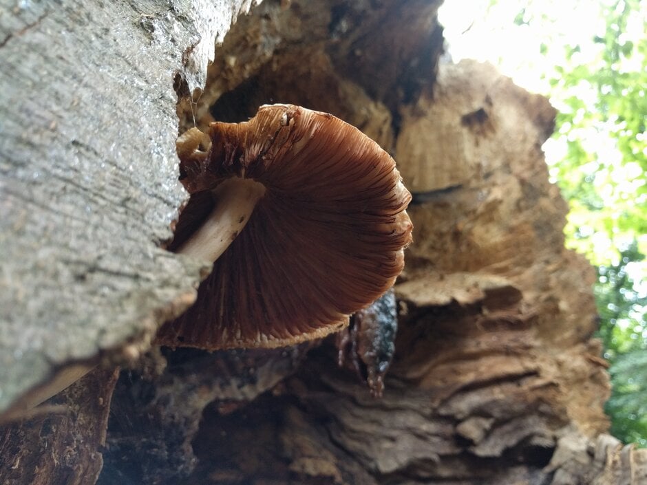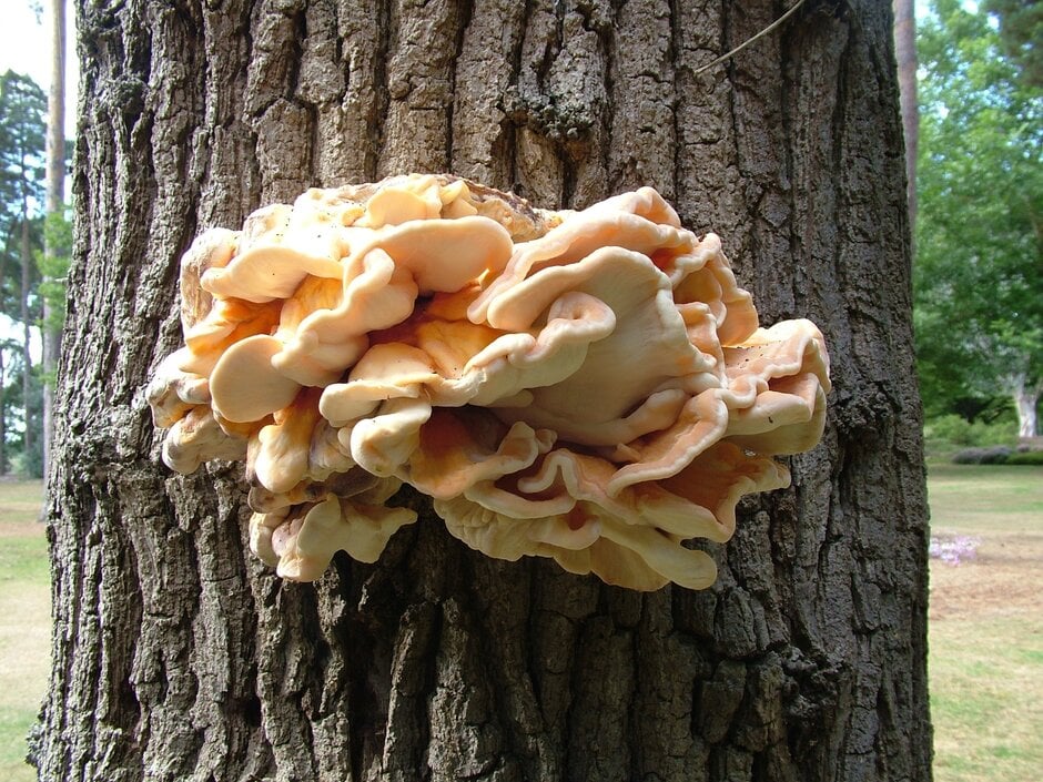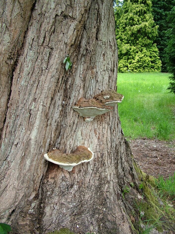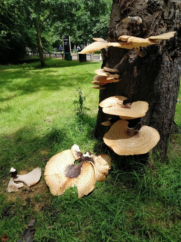 There are various ways of how heartwood fungi get into the heartwood of trees. They can enter through branches with or without heartwood, large dead branches with exposed heartwood that are still attached to the tree, wounds, bases of twigs, root grafts and sapwood of roots. Fungi feed on the heartwood of the tree while growing their mycelium through the wood. They exit the heartwood by producing fruiting bodies. These can appear on the main trunk, branches, often appearing on wounds where the heartwood is exposed. However, that does not mean that the spot where the fungus entered the tree and where it came out is the same as the time span between the two events can take many years. Others may occur at the base, such as the giant polypore (Meripilus giganteus) or dyer’s maizegill (Phaeolus schweinitzii).