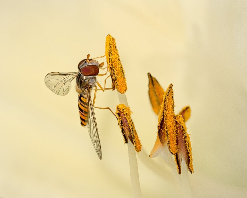 D) Depending on the species, hoverflies can overwinter as adults or live for only a few days. Many species are brightly coloured, with spots, stripes, and bands of yellow or brown.