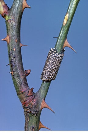 Lackey moth adults are mid-brown in colour and have a wingspan of approximately 30 mm. They lay eggs in bands of 100-250 that encircle the stems of a wide range of deciduous trees and shrubs.
