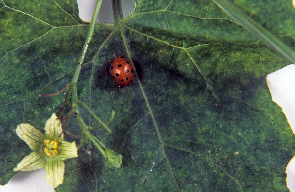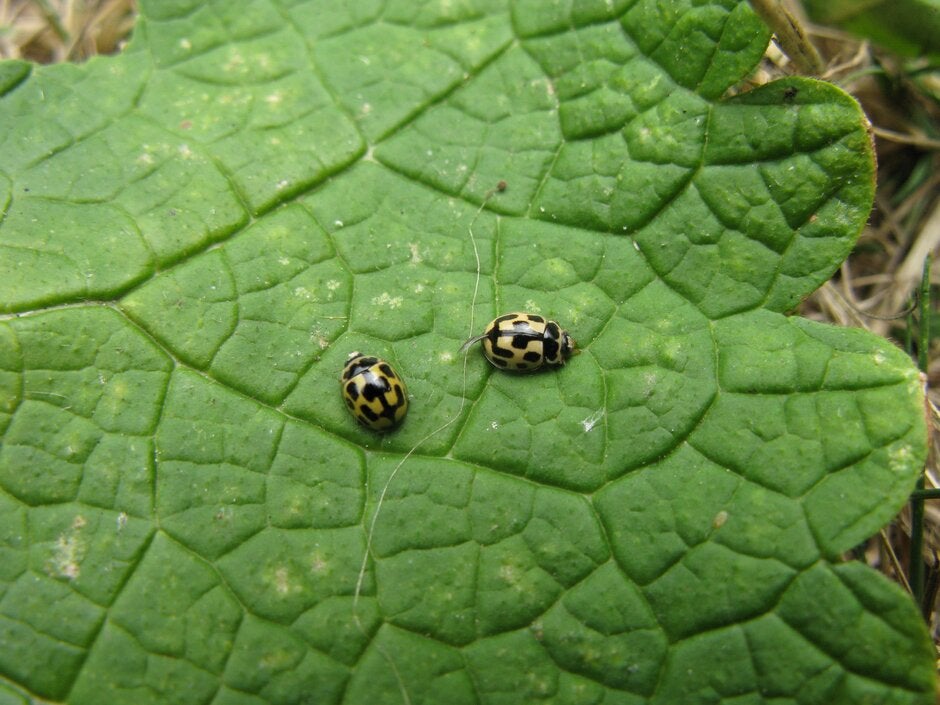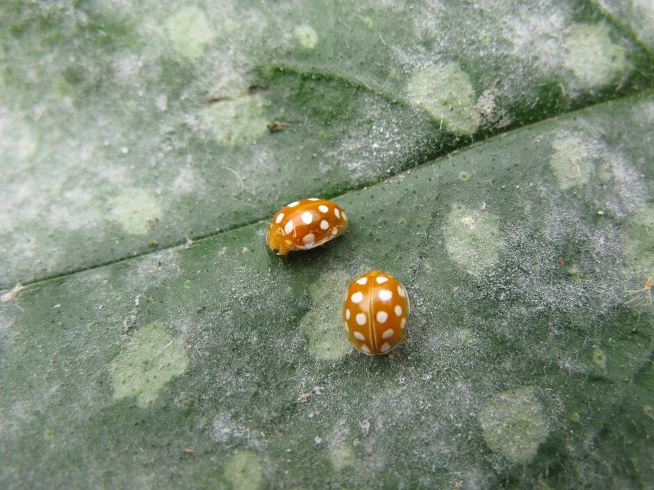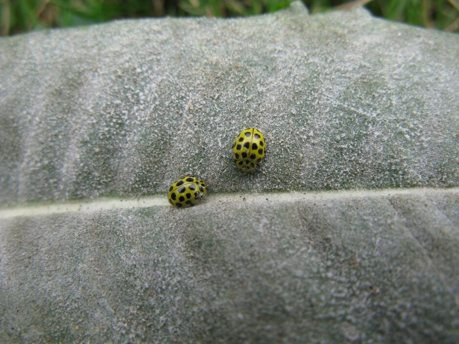 Twenty-two spot ladybird, Psyllobora vigintiduopunctata. A 3-4 mm long yellow ladybird with 20 to 22 spots. Larvae are yellow with black markings. Feeds on mildews on a wide variety of plants.