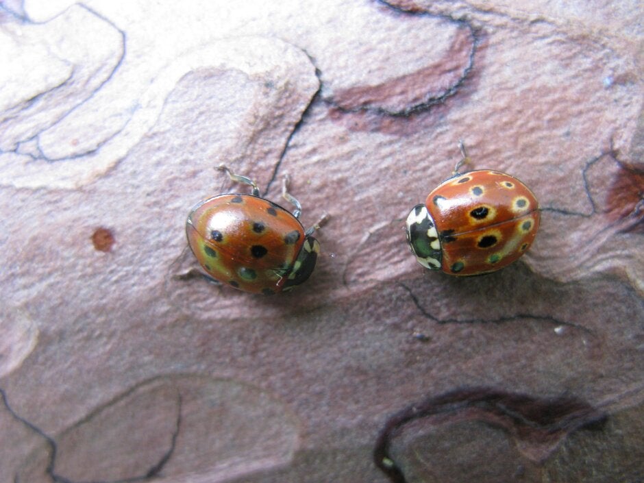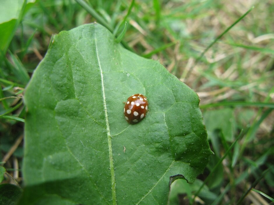 Cream spot ladybird, Calvia quatuordecimguttata. A brown ladybird with 14 cream spots, 4-5 mm in length. Larvae are grey with two pale markings. Usually found on trees feeding on aphids and plant suckers (psyllids).