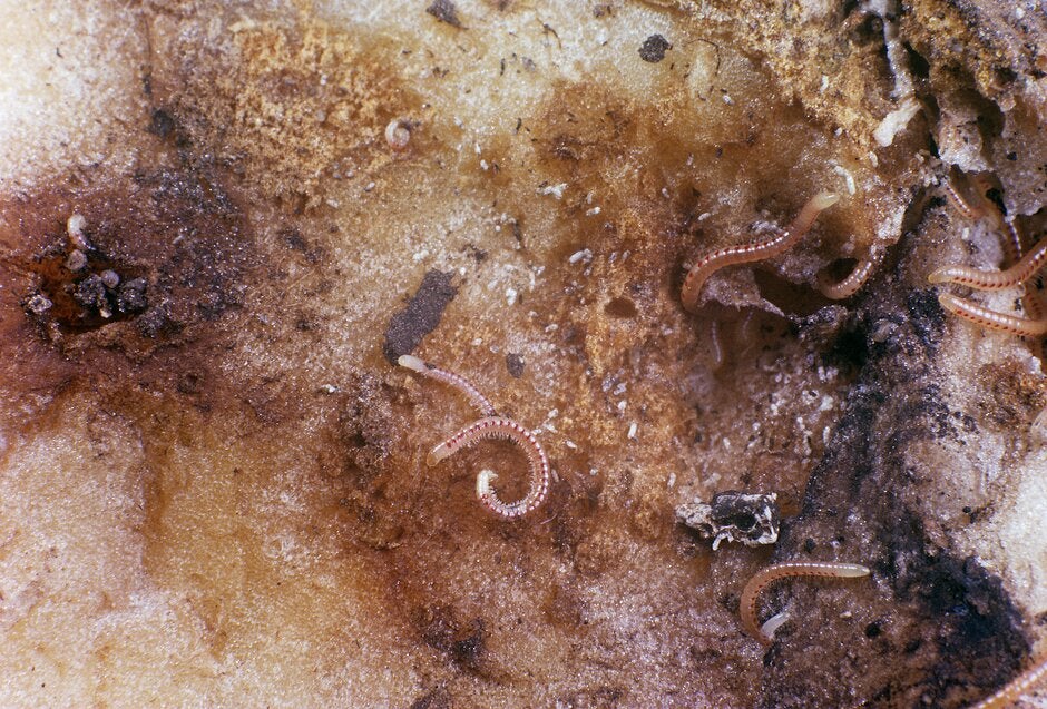 Millipedes feed mainly on decaying plant material and the associated fungal growth. They will occasionally damage and other soft growth, such as strawberry fruits , although damage is usually initiated by other animals such as slugs . Millipedes, especially the spotted snake millipede, are sometimes found feeding inside , potato tubers and on other root vegetables. In this situation, they are enlarging damage initiated by slugs or some other animal or a disease. The relatively weak mouthparts of a millipede will make little impression on healthy undamaged bulbs, roots or tubers.