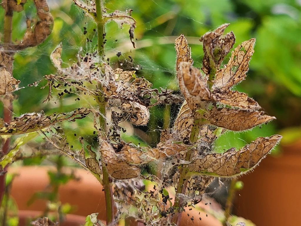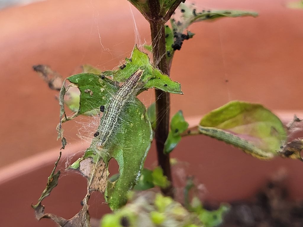 - Young growth at the shoot tips is often damaged, leaves may be curled over, small amounts of fine webbing and tiny black pellets of caterpillar excrement will be present