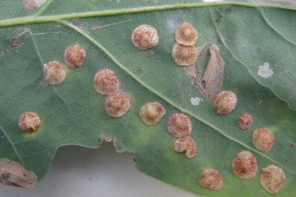 Silk button gall wasp (Neuroterus numismalis) creates 3 mm diameter golden brown discs with a pronounced central depression on the underside of oak leaves in late summer-early autumn. The next generation in spring forms small oval galls on the male catkins and leaf margins.
