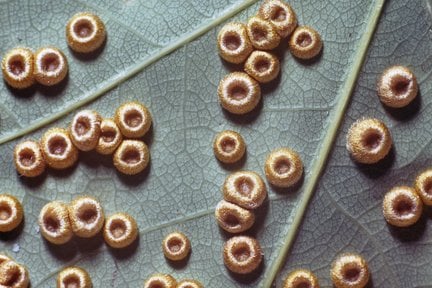 Common spangle gall wasp (Neuroterus quercusbaccarum) causes yellowish gingery brown disc-like galls 3-4 mm in diameter on the underside of oak leaves in late summer-early autumn. The galls drop to the ground in autumn and females emerge in spring to lay eggs on the male catkins. The next generation causes spherical fleshy galls 5-6 mm in diameter on the catkins. These galls are yellowish green or reddish in colour and are known as currant galls.