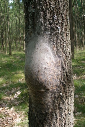 In addition the caterpillars construct white webbing nests on trucks and branches of oak trees. The white silk often discolours brown. During late spring and early summer the caterpillars spend much of the day in the nests leaving in processions to feed at dawn and dusk, occasionally they will process between oak trees. The empty nests can remain present throughout the winter.