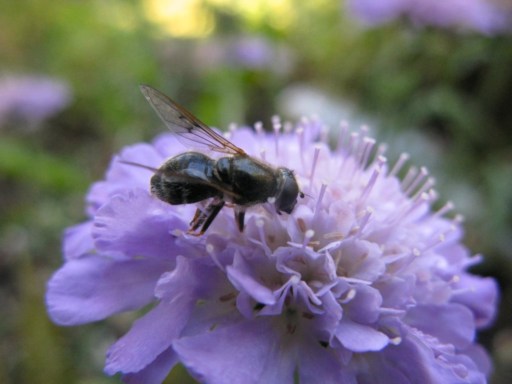 Hoverflies are true flies and belong to the order Diptera, family Syrphidae. There are more than 6000 species of fly in Britain of which over 280 are hoverflies. Hoverflies get their name from their ability to hover in mid-air. Many hoverflies mimic wasps, honey-bees or bumble-bees with stripes, bands and markings of black and yellow. Sempervivum leaf miner is a small bluish grey species. Adult hoverflies are pollinators and the larvae of most species are predators or help recycle organic matter (detritivores), very few feed on living plant material. Read more about hoverflies .