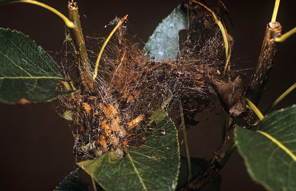 Webbing on leaves and branches of pear and some other plants. This webbing contains pale orange caterpillar-like larvae. Leaves within the webbing are consumed.