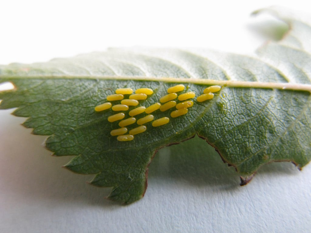 There is one generation of social pear per year. Eggs are laid on foliage in May and June. The orange caterpillar-like larvae are found during June and early July. They feed in groups within webbing and reach 25 mm long when fully grown. When the larvae have completed their feeding they go down into the soil where they pupate and emerge as adults the following spring.