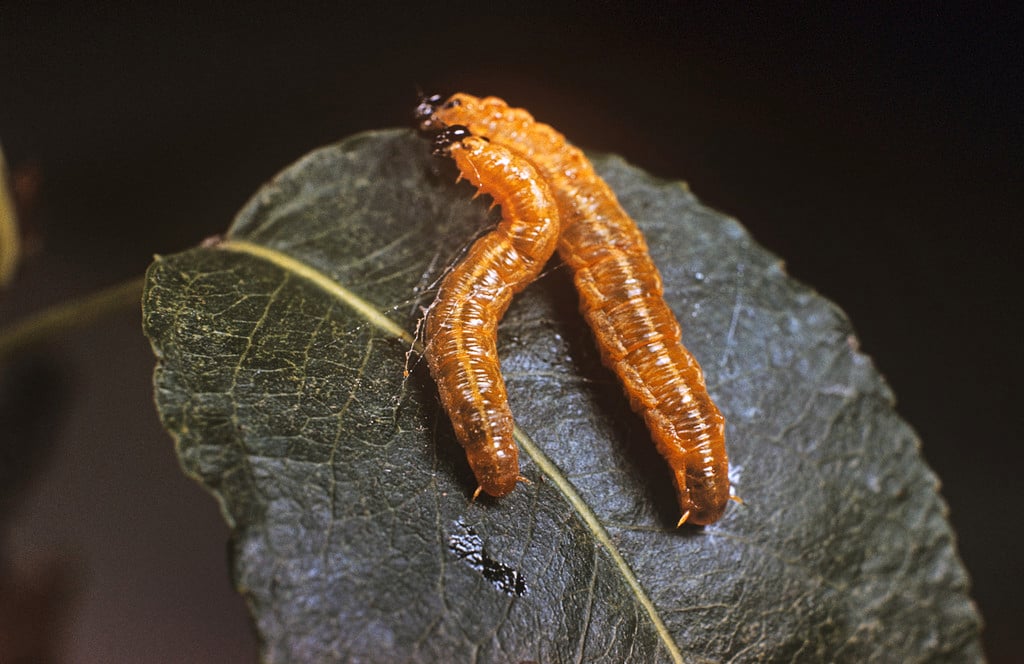 Main symptoms - Orange caterpillar-like larvae and webbing