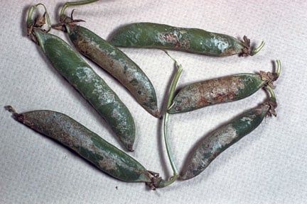 Pea thrips (Kakothrips pisivorus) Found on garden peas during June to August; causes stunted growth with a silvery brown discolouration on the foliage and pods; the latter may remain flat with just a few peas developing at the stalk end.