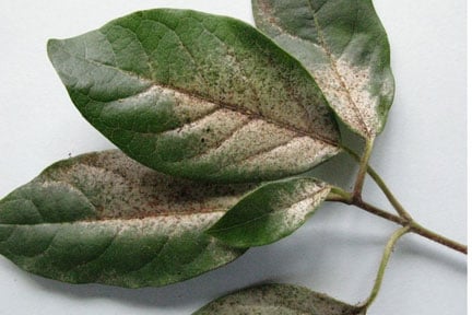 Leaves fed upon by thrips often become dull green and later develop a silvery-white discolouration on the upper surface. The discoloured areas are usually marked by many tiny black excrement spots.