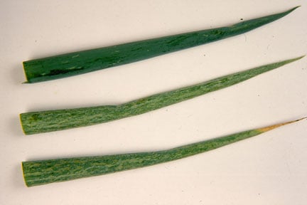 Onion thrips (Thrips tabaci) Causes a whitish mottling on the leaves of onion and leeks. It also feeds on a wide range of other plants, including carnation, chrysanthemum, begonia, cyclamen, dahlia, tomato and cucumber. It causes silvering of the foliage and on some plants, such as dahlia, feeding at the shoot tips results in severely stunted growth and distorted leaves.