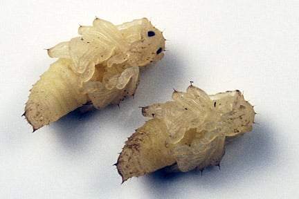 - Vine weevil grubs amongst the roots of your plants: The plump c-shaped white legless larvae have light brown heads and are up to 10 mm (about 3/8 in) long. They are likely to be found among the roots