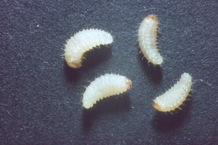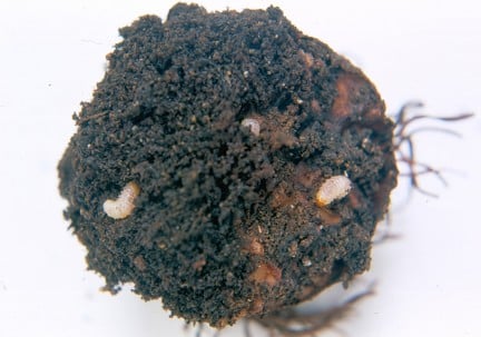 More serious is the damage can be caused by the soil-dwelling larvae, which are plump, white, legless grubs up to 10mm (about 3/8in) long with pale brown heads. These eat the roots of a wide range of plants and can bore into tubers of cyclamen and begonia, and into stem bases of cacti and . They can kill woody plants by gnawing away the outer tissues of the larger roots and stem bases. Most plant losses occur during September to March, when the grubs are becoming fully grown.