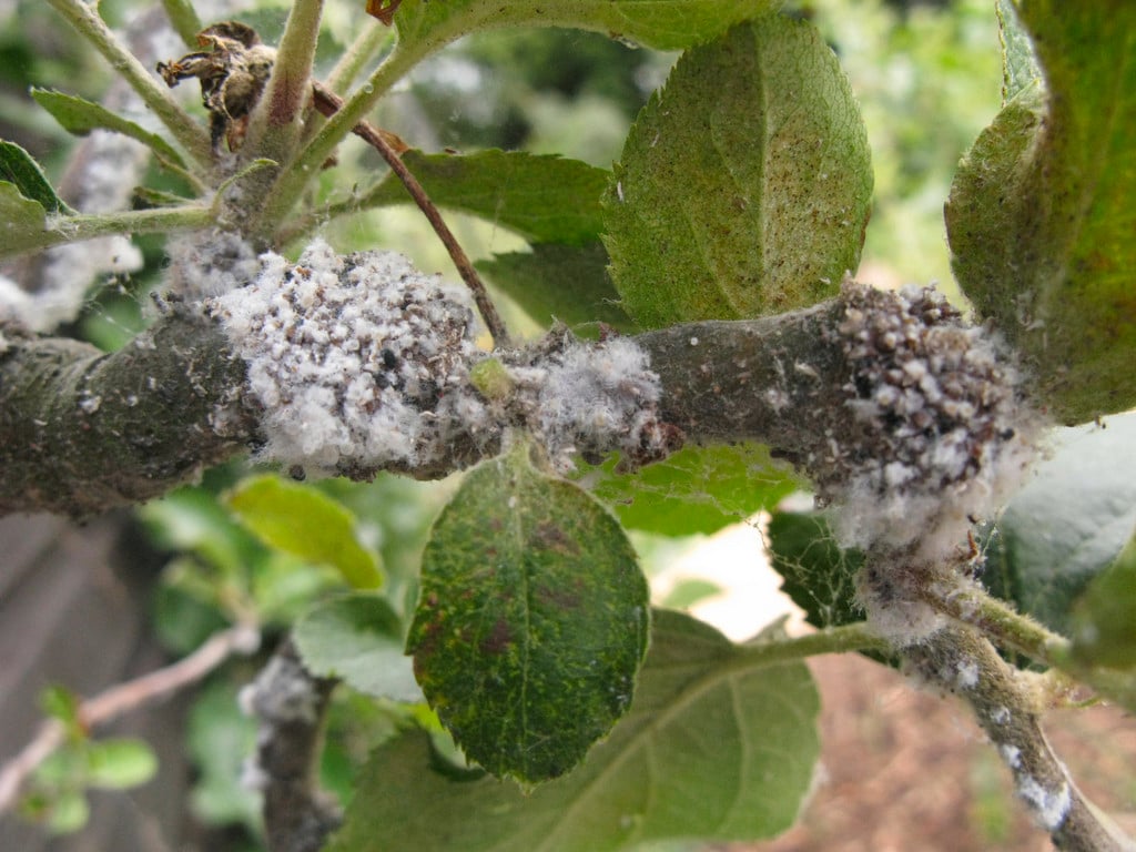 - The thinner bark around old pruning cuts is a prime site for woolly aphid colonies in spring but by mid-summer the insect spreads to younger shoots