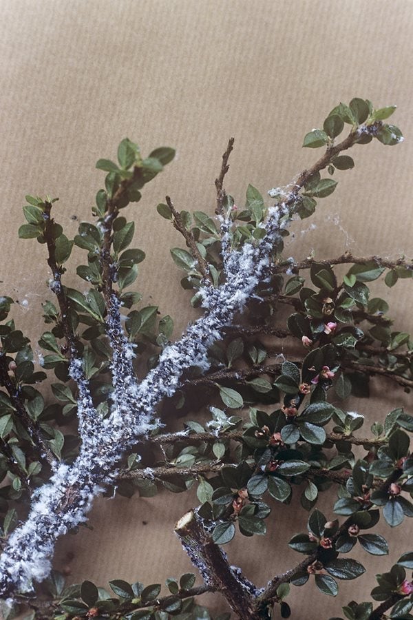 Woolly aphid is a black aphid that sucks sap from woody stems of apple, cotoneaster and pyracantha and covers itself in a white waxy secretion.
