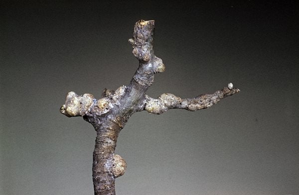 Main symptoms - Lumpy swellings on the bark and, in summer, colonies of aphids covered in white fluff on the trunk and branches