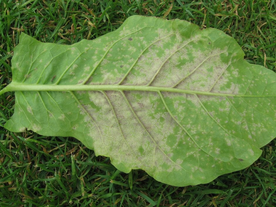 - A mould-like growth on the underside of the leaf, corresponding to the blotch on the upper surface. This growth may be white, grey or purple, depending on the species of downy mildew