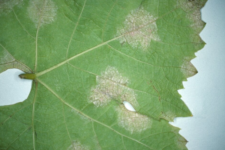 - Powdery mildew on the leaves and fruit – caused by the fungal pathogen Erysiphe necator