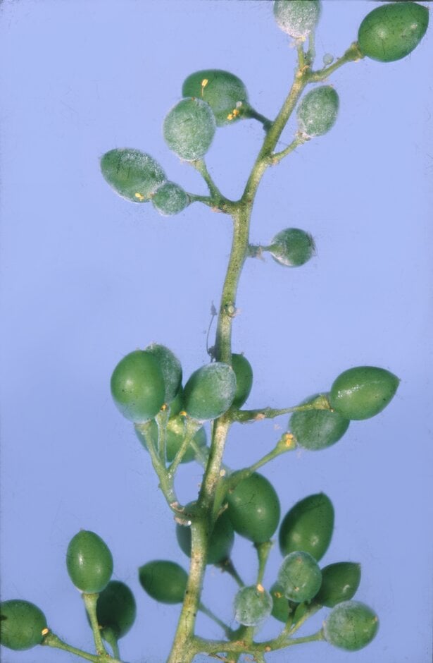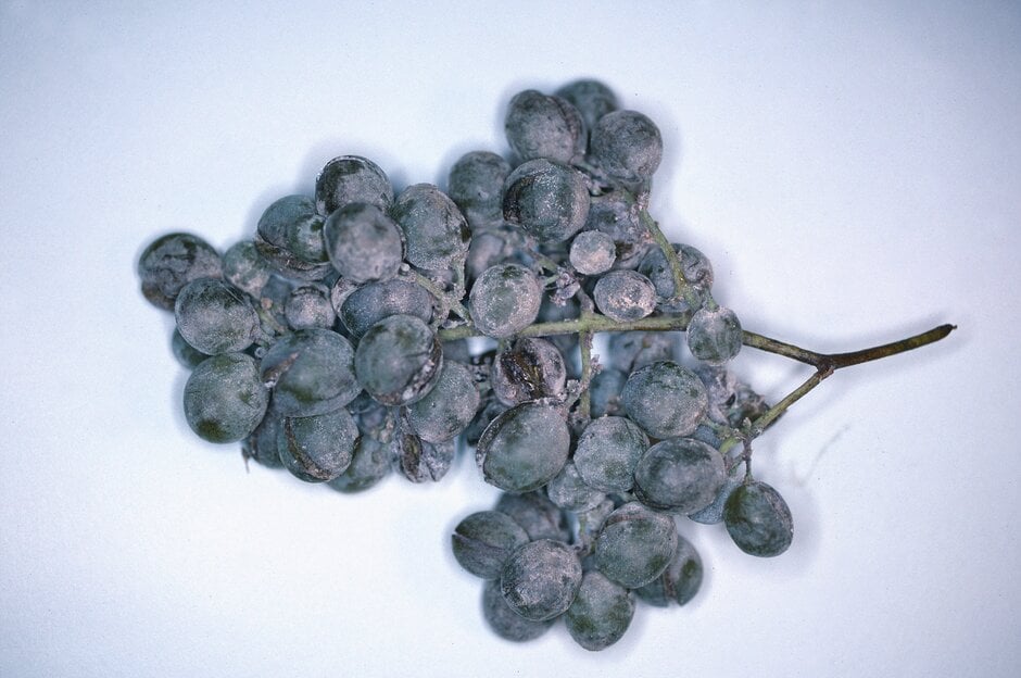 - Fruits damaged by powdery mildew are often then infected by the grey mould pathogen and rot, or become mummified