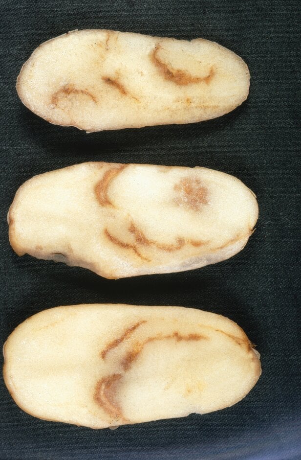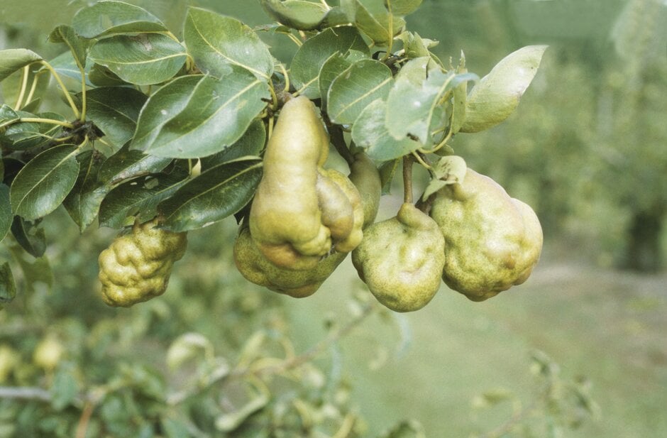 - On fruit: Distortion and irregular colour patterns such as marbling or ringspots, and malformed contents