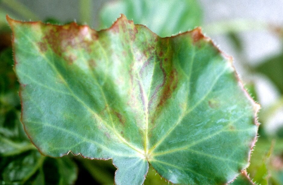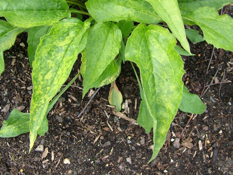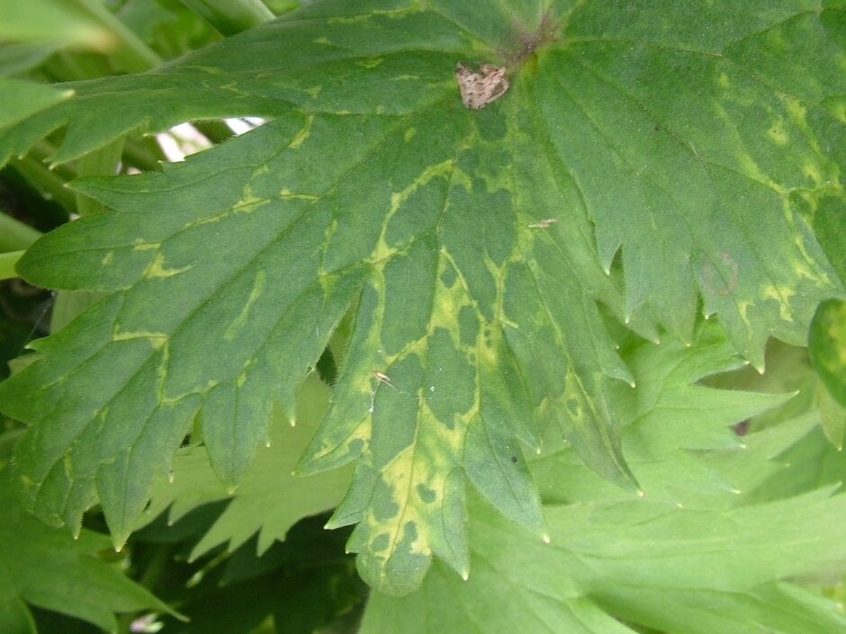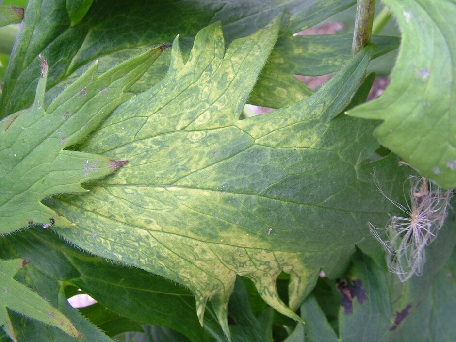 - On leaves: Pale green or yellow (chlorotic) patterns including spots, streaks, mottle, mosaic and oakleaf patterns, ring spots, vein clearing (the leaf veins themselves become pale or colourless) or vein banding (the areas immediately adjacent to the veins are paler or a different colour). Ocassionally the areas affected by these various symptoms are other colours, such as red or purple. There may be spots of brown, dead (necrotic) tissue. You may also see narrowing of leaves, stunted growth or distortions, sometimes with very reduced surfaces between the veins (puckering), resembling damage by hormone weedkillers. Leaves may be also be rugose (wrinkled), rolled, or bent down (epinasty)