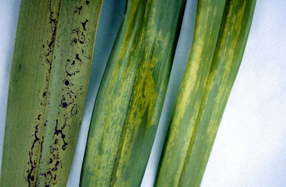 A note on virus names: Viruses are named according to the type of symptom they cause in the first host in which they were discovered, though this is often only the first of many. Thus, Bean yellow mosaic virus actually infects a wide range of plants as well as beans; some are in the family Iridaceae, completely unrelated to legumes.