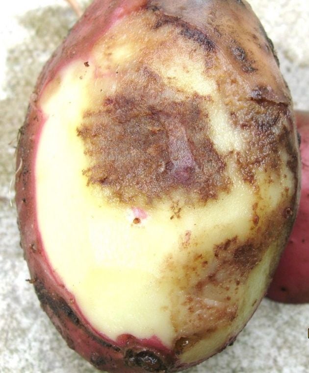- Affected tubers have soil sticking to them at lifting, and discoloured patches on the skin