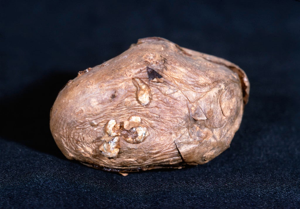 - Brown, often wrinkled, patches on the skin correspond to internal cavities lined with white, pink or bluish fungal growth