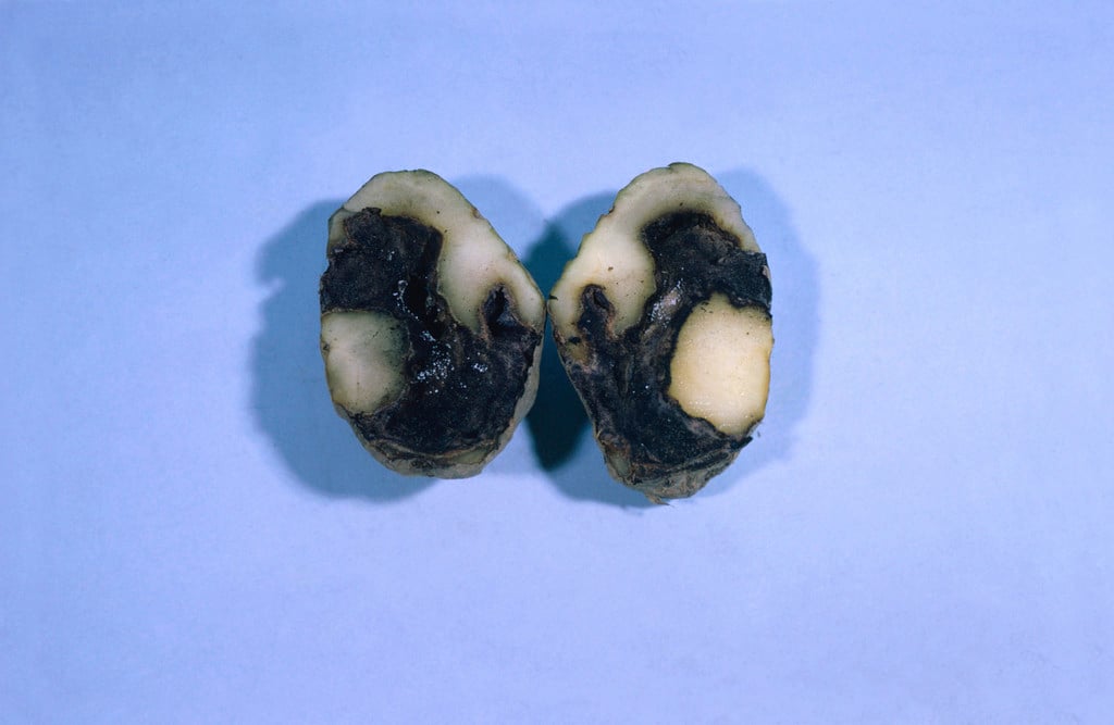 - Cutting the tuber open reveals a reddish-brown, granular rot, often just below the skin