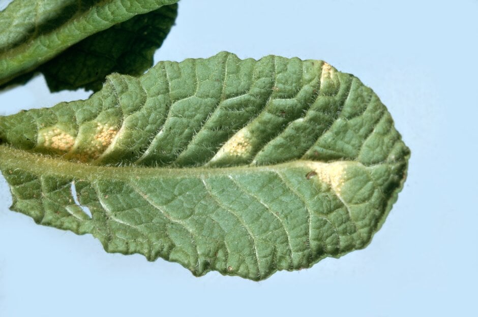 Species of Ramularia and Phyllosticta cause leaf spots on many plants. Ramularia infections are sometimes called white moulds because of the white fungal outgrowth from infected tissues. Infections caused by rust fungi are not strictly classified as leaf spots, but the symptoms caused by Puccinia primulae on primulas will be seen by gardeners as spots.