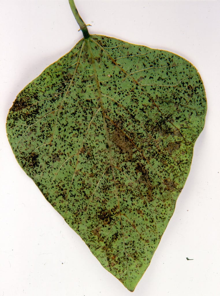 Main symptoms - Brown, black or white spore pustules on leaves, stems or pods.