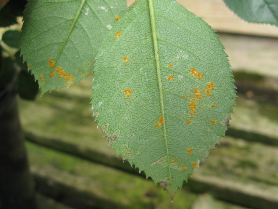 The colour of the rust pustules varies according to the rust species and the type of spore that it is producing. Rose rust, for example, produces orange pustules for much of the summer, but in late summer and autumn these are replaced by black pustules containing overwintering spores.