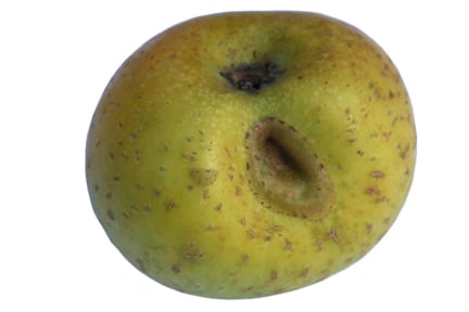 If the fruits are undersized, with a pinched appearance at the eye end, it is likely that the affected fruits were infested earlier by rosy apple aphids . If there are isolated, corky bumps then capsid bugs may have been responsible.