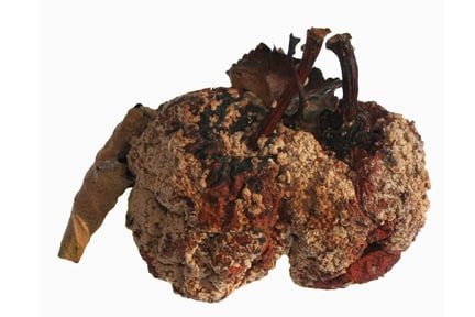 Question: Some of the fruit on my tree has gone brown and rotten, and is covered in light brown pustules. What is the cause?