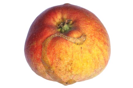 - Fruit affected by the larvae of apple sawfly often fall from the tree in June or early July. Sometimes sawfly larvae feed only beneath the skin of the young fruitlet rather than burrowing into the core – these fruit usually survive but have a long ribbon-like scar on the exterior by the time the fruit is ripe
