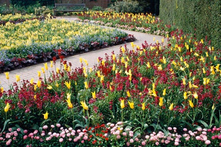 Informal bedding: can be used less formally in the garden, perhaps to brighten up the front of a border or fill bare soil under roses. Straight lines and symmetrical patterns are not compulsory here – it’s more a case of having fun with colour and textures.